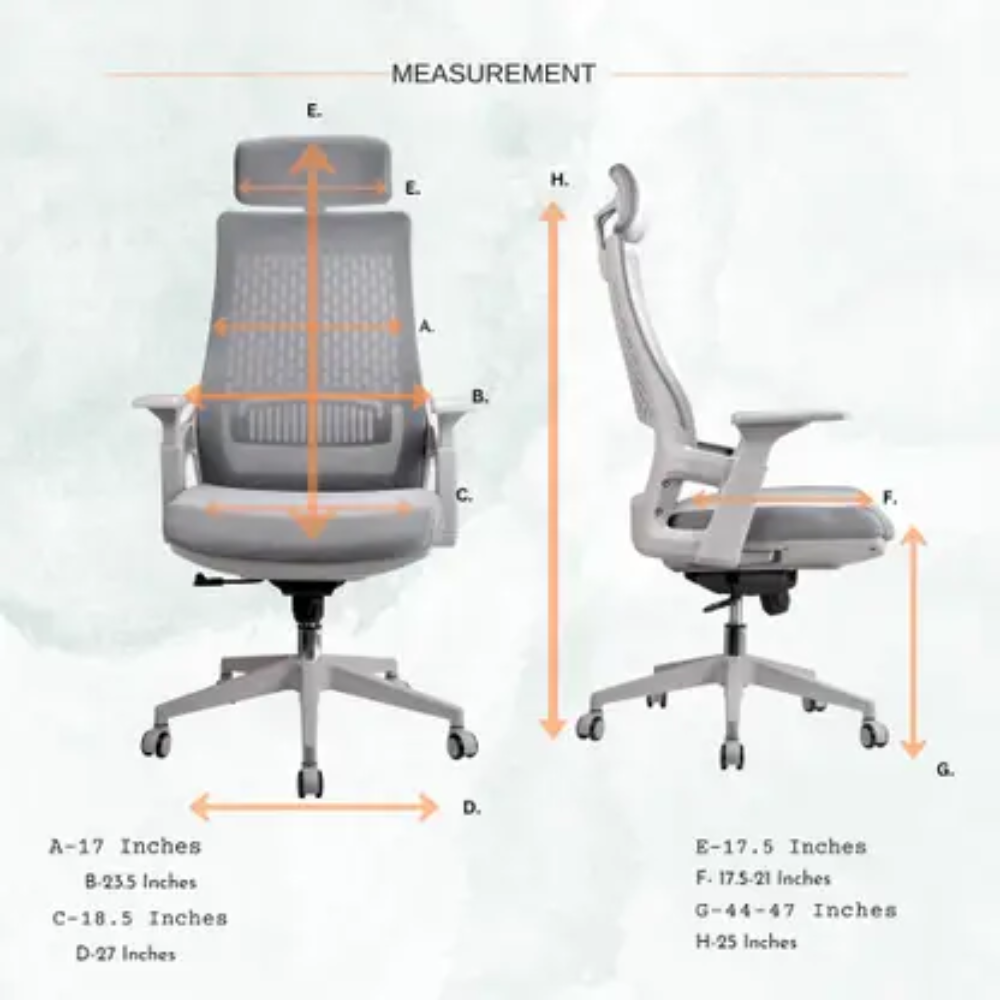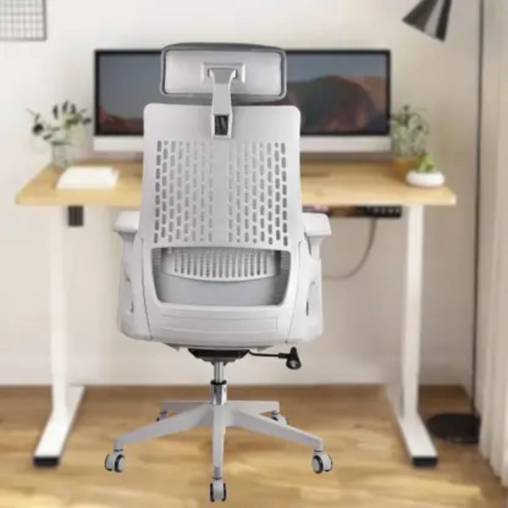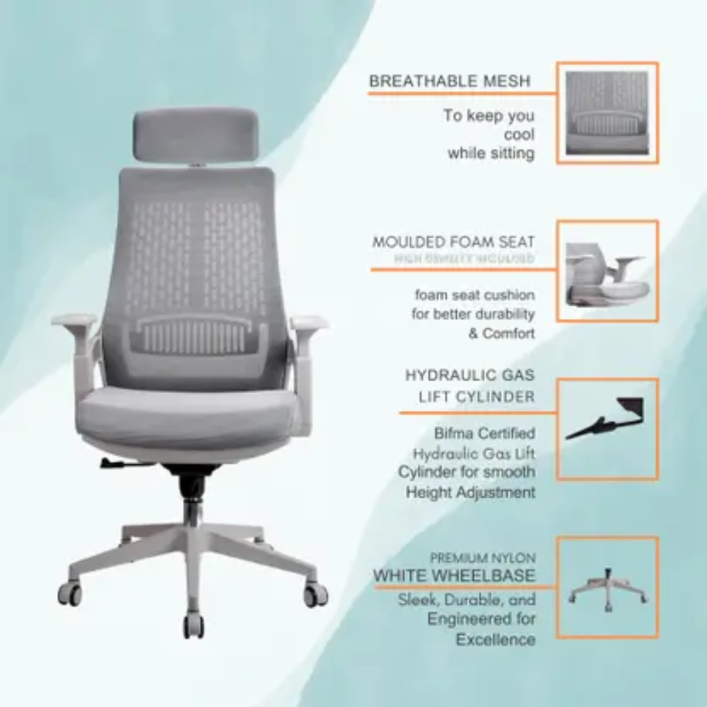 2327A White Frame Grey High Back Office Chair – Ergonomic Mesh Back, 3D Armrest, Adjustable Swivel CEO Chair