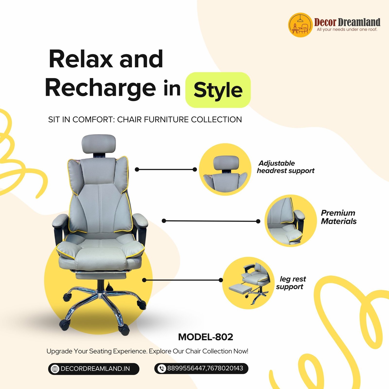 The 801 PU Gray Ergonomic Executive Office Chair combines luxury, comfort, and modern functionality to enhance your workspace. Crafted with premium PU leather and high-density foam cushioning, it ensures exceptional comfort even during extended hours of sitting.